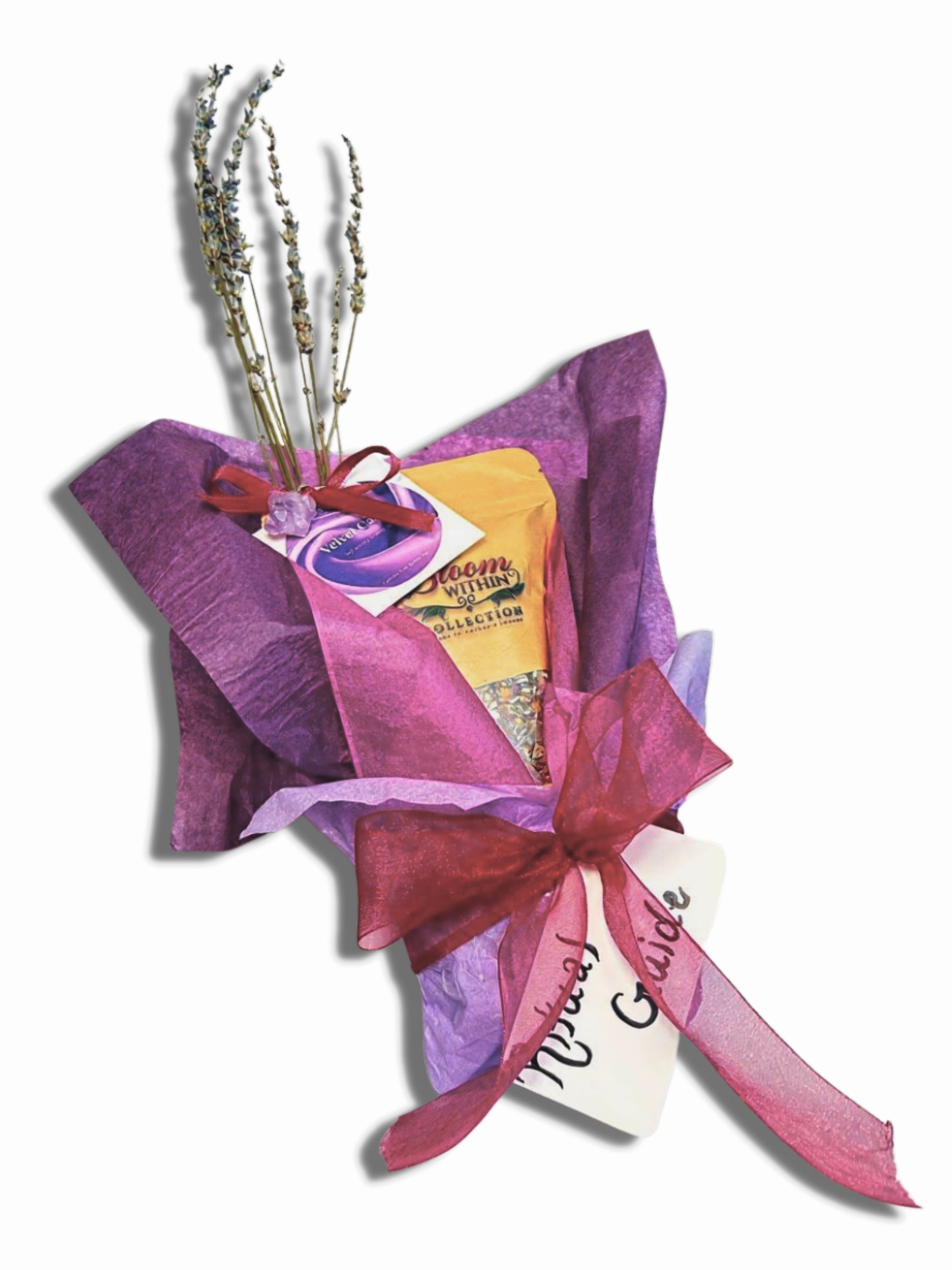 Your Velvet Calm blend arrives in a matte kraft pouch, sealed with a soft burgundy wax stamp and tied with a silk ribbon. Inside, you’ll find a folded ivory ritual guide to deepen your experience, along with a personalized thank-you note, because healing should feel beautiful.